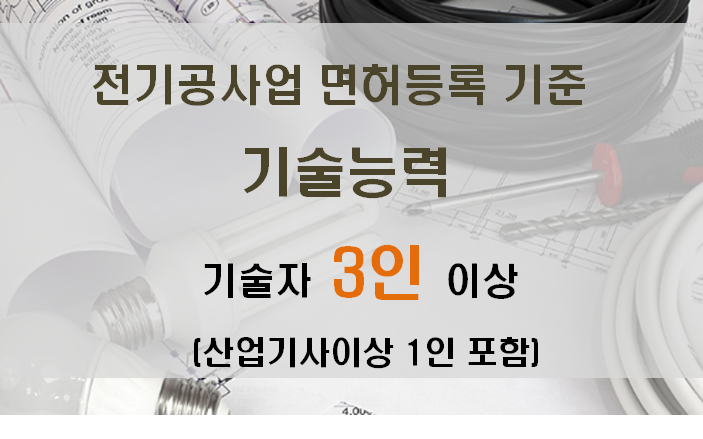 세번째로 전기공사면허는 3명이상의 기술인력을 갖춰야 합니다. 기술인3인 모두 전기공사협회에서 발급한 초급이상의